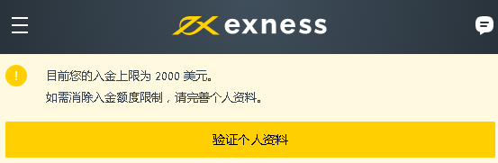 6、在没有认证身份和地址前,入金上限为2000美元,点击验证个人资料,认证后账户更加安全,限制更少。