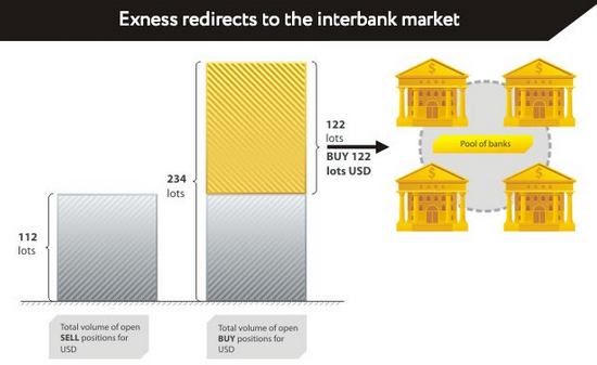 让我们看看Exness是如何运作的。所有客户的未平仓头寸按交易工具,交易量和方向(买/卖)分类。 (相同的交易工具,即使是相同的基础货币,相同数量的交易头寸)抵消了公司的抵消头寸,没有额外的套期保值(事实上,为什么支付可以相互抵消: