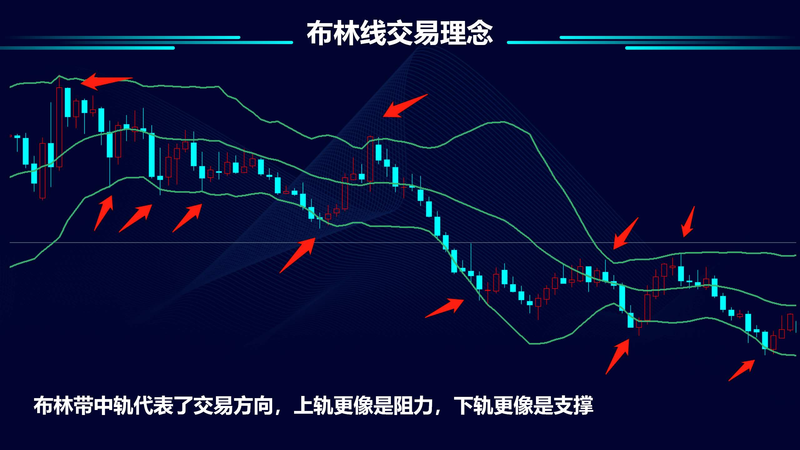 当市场上升强势趋势形成后,布林带的下轨出现转头向上,市场趋势可暂时结束。