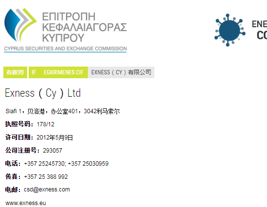 CySEC金融监管机构位于塞浦路斯共和国。 CySEC监督当地金融市场并确保遵守CySEC法规,以维持高效,公平和透明的市场。 作为欧盟,塞浦路斯的成员,CySEC许可证也被允许在其他欧盟国家进行贸易。Exness由塞浦路斯贸易委员会(CySEC)授权,并根据许可证号178/12获得许可。
